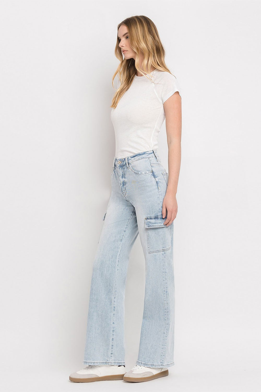 Step into comfort and style with our 90's Vintage High Rise Cargo Straight Jeans. Made with comfort stretch denim, these jeans feature a super high rise waist and distressed detailing for a vintage look. The full length and cargo straight style add versatility to your wardrobe.