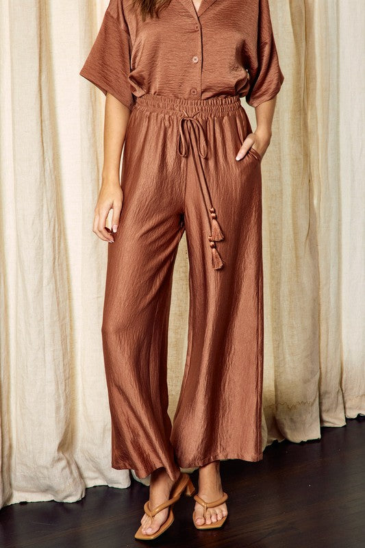 Effortlessly chic and comfortable, our Toasted Almond Wide Leg Pants are a must-have in any fashion enthusiast's wardrobe. Made with luxurious satin material and a stretch tie waist, they offer a perfect combination of style and ease. Elevate your look with these statement pants, perfect for any occasion.