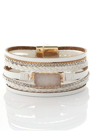 This layered white Druzy bracelet features natural stone and real leather. The natural stone adds a touch of uniqueness and the real leather ensures durability. This bracelet is perfect for adding a touch of elegance to any outfit.