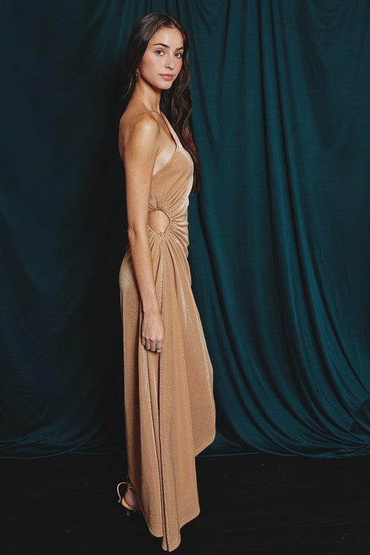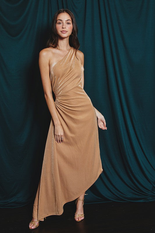 This Pearlie One Shoulder Midi Dress is perfect for any holiday event. The elegant gold color adds a touch of glamour, while the one shoulder design gives it a unique and stylish look. Make a statement this holiday season with this must-have dress.